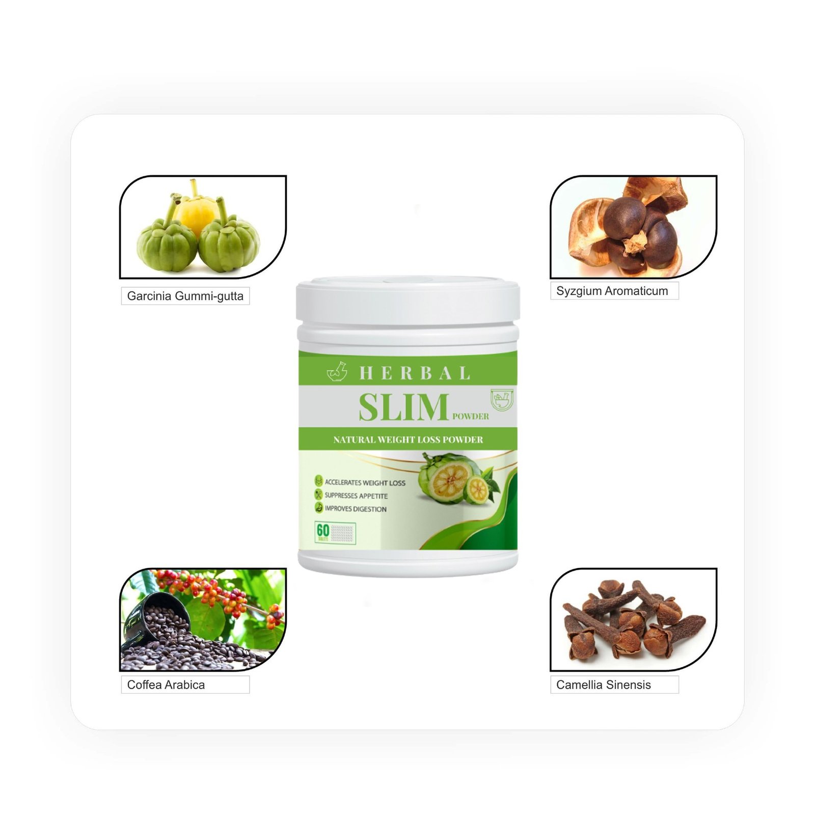HERBAL SLIM POWDER च्या या पेटंट मिश्रणात दोन घटक आहेत जे तुम्हाला लवकर फिकट होण्यास मदत करण्यासाठी एकत्र काम करतात.
